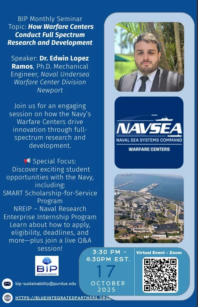 Introduction to how Warfare centers conduct full spectrum research and development. Dr. López Ramos and team will provide an introduction to the Naval Undersea Warfare Center Division Newport’s (NUWC DIV NPT) bioinspired portfolio along with current SMART scholars. There will also be a Q&A for academic collaborations, student internships and graduate student funding opportunities.